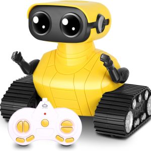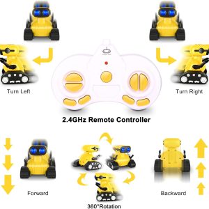 - Multifunctional Robot: LED eyes will light up once you turn on the robot, you can also closed it or let it blink by remote; voice function – turn on the robot it will start talk with you in his own language, he can also sing 3 songs which can swich by remote; the tank tracks – let the robot move forward backward left and right,when it switch to demo mode it will begin dancing.