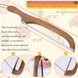 -Easy To Cutting: 10.83 inch stainless steel classic manual bread slicer is a perfect size for kitchen saw blades. A dedicated protective cover on the blade of the bread knofe, bread cutter not only protects the blade but also protects your hands. The serrated sourdough cutter is left-handed friendly, simply loosen two screws, flip the blade, finally connect. After use, wipe dry with a towel, then put on a protective cover and hang it in the storage bag, saving storage space for your kitchen