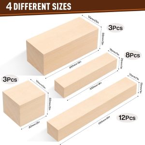 - 【What You Get】: The package contains 26 pieces of basswood blocks, 12 pieces 1x1x6 inches (2.5×2.5x15CM), 8 pieces 1x1x4 inches (2.5×2.5x10CM), 3 pieces 2x2x4 inches (5x5x10CM), 3 pieces 2x2x2 inches (5x5x5CM), 4 sizes can meet more carving needs and realize your amazing ideas.