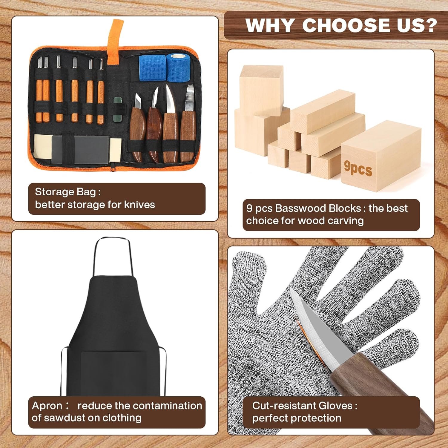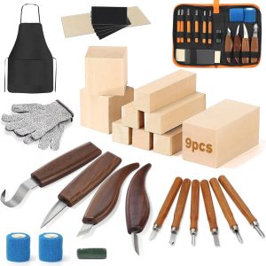 39PCS Wood Carving Kit for Beginners,Wood Carving Tools Set with 9 Basswood, Apron, Sandpaper, Gloves and Bandages, Wood Whittling Kits for Beginner…