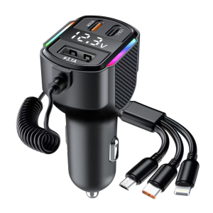 5-in-1 Car Charger Adapter, 90W Super Fast Charging with Retractable Multi Cable (USB-C/Lightning/Micro), PD 30W & QC 3.0 Ports, LED Voltage Display, Carbon Fiber Design for iPhone, Samsung, Tablets