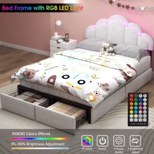 - [Eye-catching Design]Featured upholstered in white / pink PU, this upholstered platform bed adds a touch of softness to your bedroom, the headboard is equipped with LED, you can adjust these colorful colors as you like.With two storage drawers underneath the bed,this upholstered bed frame gives you extra space for storing daily necessities such as bed sheets to accessories or off-season clothing.
