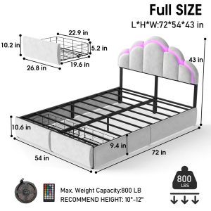Full Bed Frame with Storage Drawers, Upholstered LED Full Bed Frame with Headboard for Kids,Toddlers,Girls, Velvet Princess Platform Cute Bed with Hea